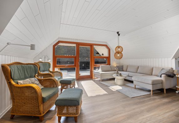 Das Wohnzimmer liegt versetzt zur Küche und bietet verschiedenste Möglichkeiten gemütliche Stunden auf dem Sofa oder dem Sessel zu verbringen. Wer mag heizt an kühleren Tagen dem Kamin an und lauscht dem Knistern des Feuers. Mit einem guten Buch in der Hand kann man hier wunderbar den Alltag hinter sich lassen und die Ruhe bei gemütlicher Ferienhausatmosphäre genießen.
