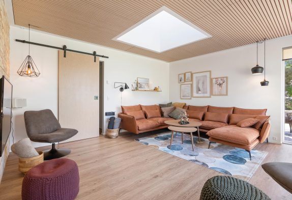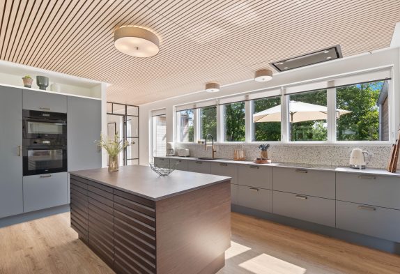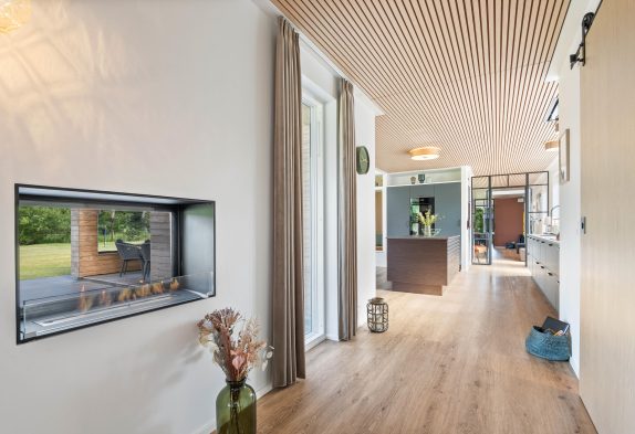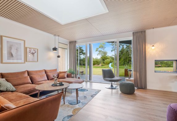 Die konsequent umweltfreundliche Bauweise fügt sich so gut in die westjütländische Natur ein, dass Grenzen verschwimmen. Das je nach Jahreszeit in verschiedenen Farben leuchtende Sukkulentendach und die mit schnell nachwachsendem Abodo-Holz verkleideten Fassaden außen, sowie der spezielle Lichteinfall durch die schornsteinförmigen Oberlichter innen, die großen Glasfronten und die in der gesamten Inneneinrichtung verwendeten Naturmaterialien geben euch das ganz besondere Gefühl, auch im Haus ganz nah an der Natur zu sein.