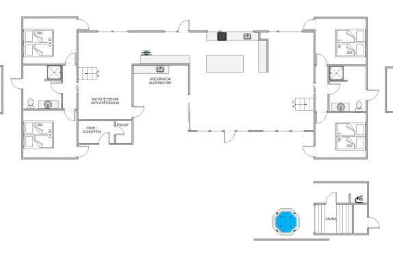 Die tollen Ausstattungsmerkmale wie Außenwhirlpool, Außensauna (sowohl Infrarotsauna als auch Saunaofen), Außendusche* und auch die teilweise überdachte Terrasse laden zu vielen Stunden an der frischen Luft ein. Für die Kinder gibt es richtig viel Platz zum Herumtoben und Spielen. Für die Kleinsten ist das Trampolin mit Sicherheit ein Hit, ebenso wie der viele Platz, um Fußball zu spielen. An kühleren Tagen bietet es sich an, den Aktivitätsraum auszutesten. Hier habt ihr die Möglichkeit, euch bei einem Tischtennisturnier oder auch Tischfußball auszupowern.