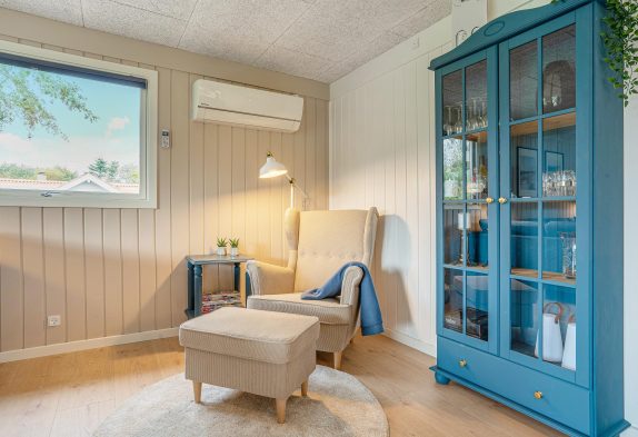 Der Wohnbereich überzeugt mit gemütlichen Sitzmöglichkeiten und einem modernen Fernseher, der mit Google Chromecast ausgestattet ist – perfekt für entspannte Stunden, in denen Filme und Serien gestreamt werden können. Für ein angenehmes Raumklima sorgen die Wärmepumpe und der Pelletofen, die das Ferienhaus auch an kühleren Tagen wohlig warmhalten.