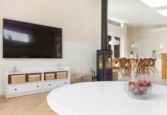 Während gespielt und entspannt wird, kann der Koch der Familie bereits das leckere Abendessen zubereiten – die Küche bietet euch hierfür eine ideale Ausstattung mit Induktionsherd, Mikrowelle und Geschirrspüler. Für eine angenehme Atmosphäre sorgt das prasselnde, wärmende Feuer des Kaminofens sowie die Fußbodenheizung im Wohnbereich.