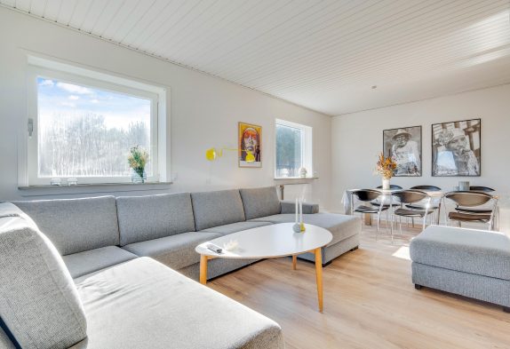 Bereits bei Ankunft könnt ihr euch in eurem Ferienhaus wie zuhause fühlen. Eine Wärmepumpe sorgt energiesparend für eine angenehme Temperatur. Über ein paar Stufen erreicht ihr vom Küchenbereich die Sofaecke. Schnappt euch euer Lieblingsbuch und entspannt auf der gemütlichen Couch. Der wärmende Kaminofen befindet sich im Zentrum des Ferienhauses und sorgt so für eine gemütliche Atmosphäre. Über Bluetooth könnt ihr zudem eurer Lieblingsmusik lauschen und so entspannte Stunden verbringen.