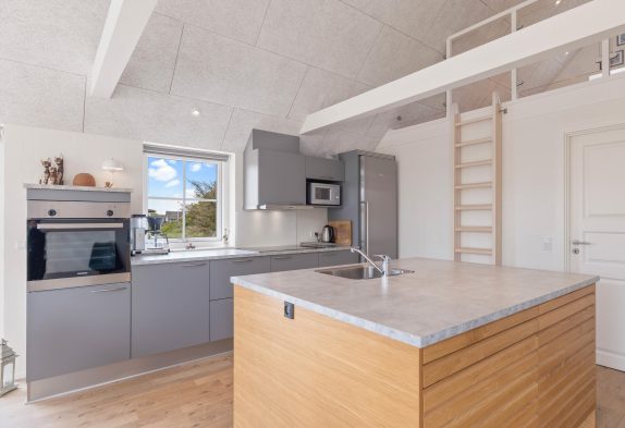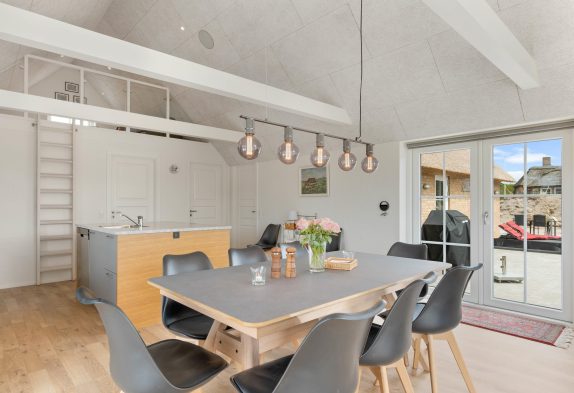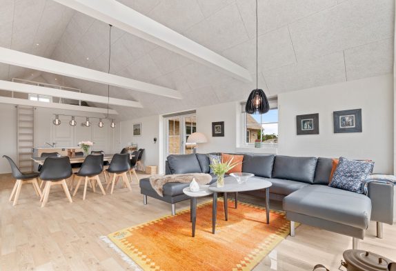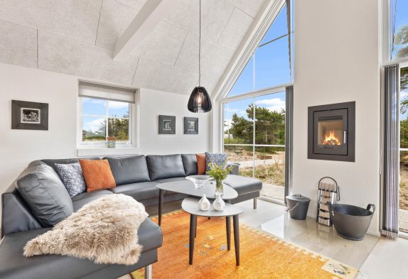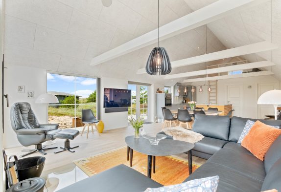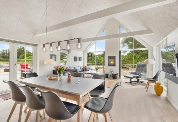 Die Küche, das Wohnzimmer und das Esszimmer sind offen miteinander zu einem großen Wohnraum verbunden und bilden so einen großen Raum, in dem die ganze Familie zusammenkommen kann. In der Küche wurde an jedes Detail gedacht, sodass ihr weniger Zeit mit praktischen Aufgaben und mehr Zeit mit der Familie verbringen könnt. Im Wohnraum könnt ihr es euch nach einem langen Tag am Strand auf dem weichen Sofa gemütlich machen und eure Lieblingsfilme auf dem Flachbildfernseher anschauen, während ihr die Wärme des knisternden Holzofens genießen, welcher für die typische Ferienhausatmosphäre sorgt.
