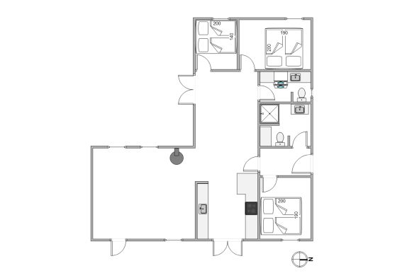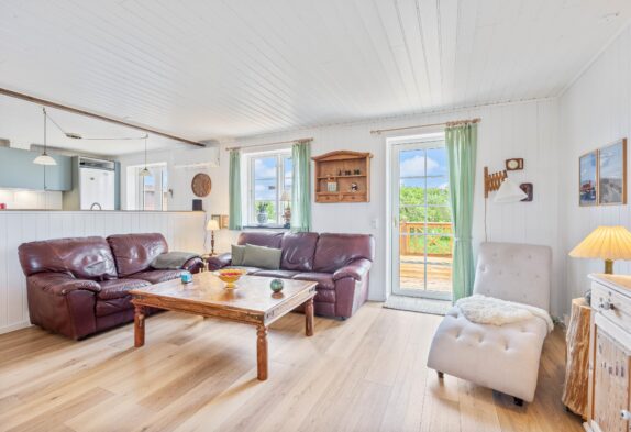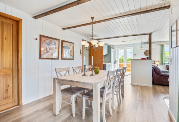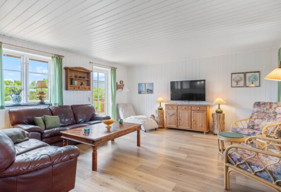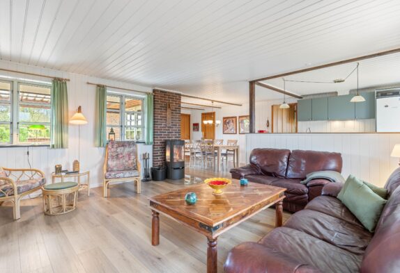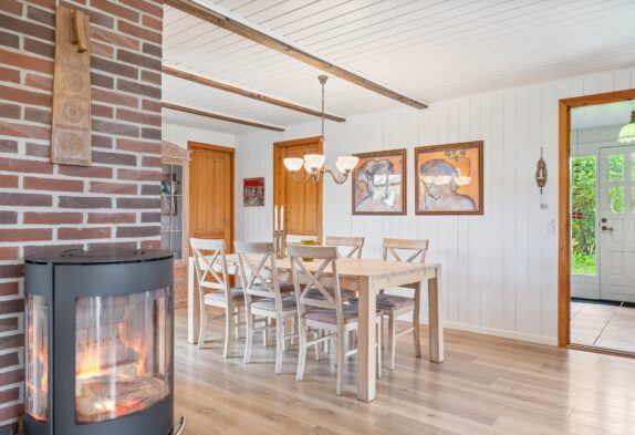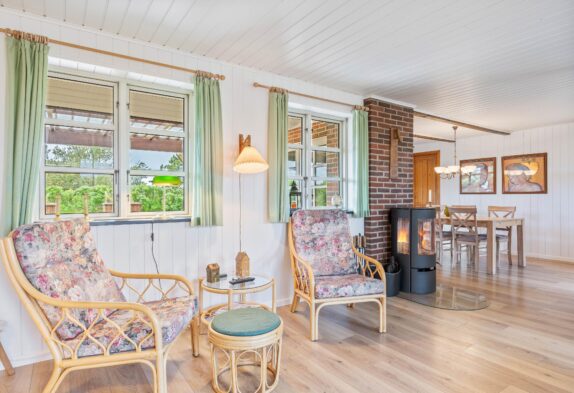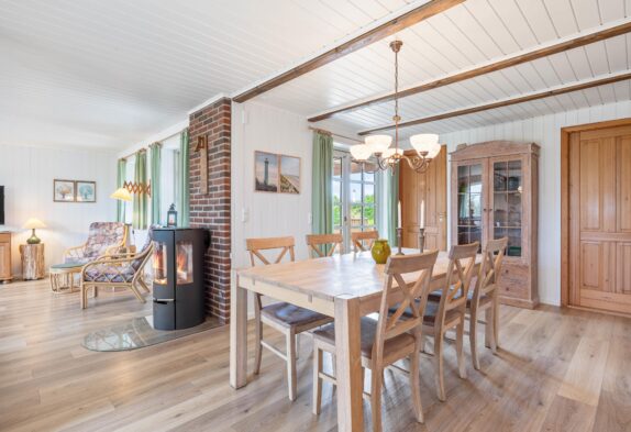 Die Küche, das Wohnzimmer und der Essbereich sind offen in den Wohnraum integriert. So könnt ihr die Gesellschaft der anderen genießen, auch wenn einige in der Küche kochen und andere im Wohnzimmer entspannen. Im Wohnzimmer gibt es einen Holzofen, der für Wärme und die typische, gemütliche Ferienhausatmosphäre sorgt.