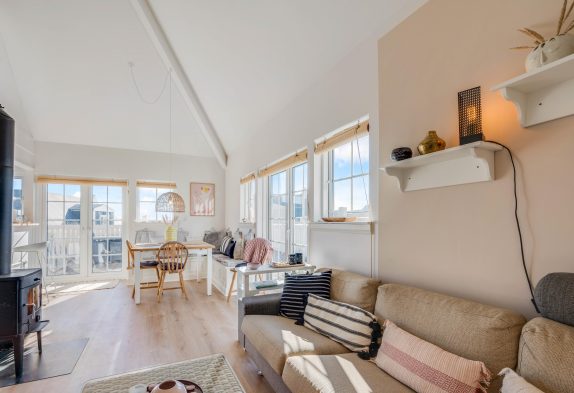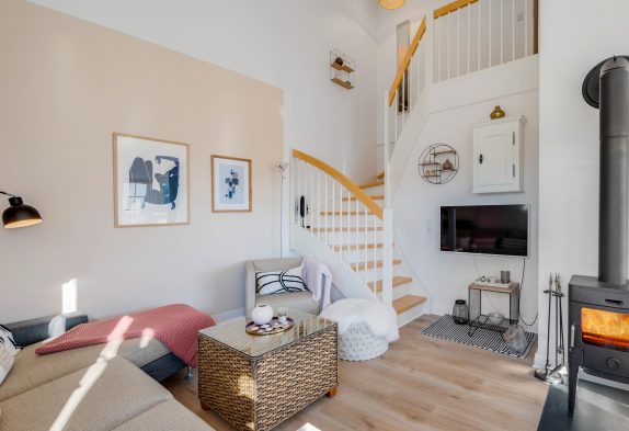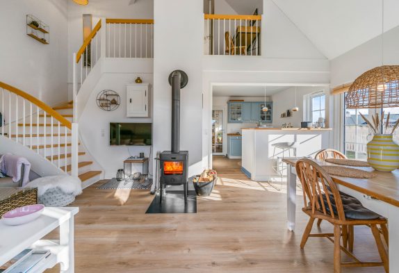 Der Wohnbereich ist hier ganz klar das Herzstück der Wohnung und die gemeinsame Zeit im Urlaub kommt hier bestimmt nicht zu kurz. An kühlen Tagen könnt ihr es euch, mit einem guten Buch und einer Tasse heißer Schokolade, auf dem Sofa bequem machen, das Knistern und die Wärme vom Holzofen genießen und den Alltag einmal Alltag sein lassen. Dank schnellem Internet braucht ihr auch im Urlaub nicht auf eure Lieblingsserie zu verzichten, diese könnt ihr über Chromecast direkt auf den Fernseher streamen. Somit steht auch einem entspannten Fernsehabend nichts im Wege.