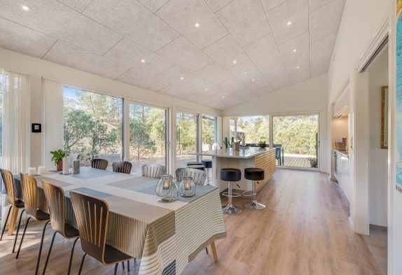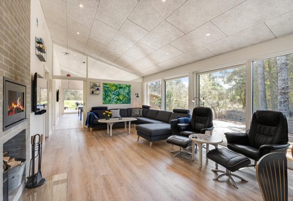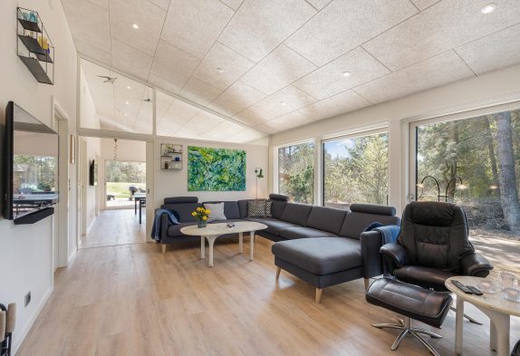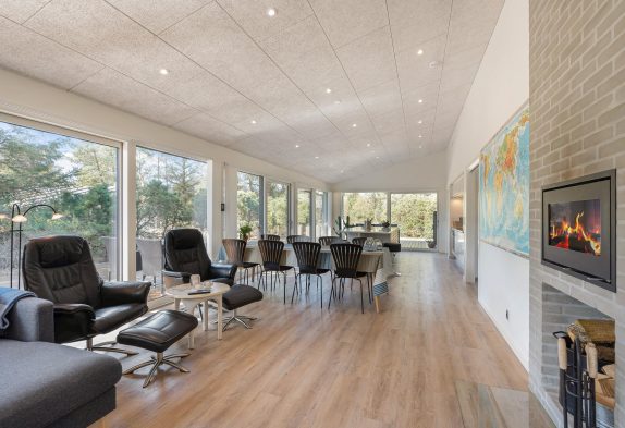 Die supermoderne Küche mit viel Platz, in der alle beim Essenzubereiten teilnehmen können, ist mit dem Ess- und Wohnbereich integriert. Durch die vielen Fenster dringt viel Licht in die Räume und der Ausblick ins Grüne ist von überall möglich. Im Wohnbereich befinden sich bequeme Sitzgelegenheiten, in denen ihr gemütlich ein Buch lesen oder einen spannenden Film ansehen könnt. Lasst den Tag beim Knistern des Holzes im Kaminofen ausklingen – vielleicht bei einem Glas Wein. Überall in diesem Ferienhaus ist Fußbodenheizung und auch ein Glasfaser Internet ist installiert.