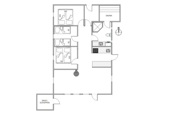 Das Ferienhaus hat insgesamt drei Schlafzimmer, wovon eins mit zwei Einzelbetten, und die anderen beiden mit zwei Doppelbetten ausgestattet sind. Umgeben von der Ruhe der Natur, findet Ihr bestimmt in einen erholsamen Ferienschlaf.