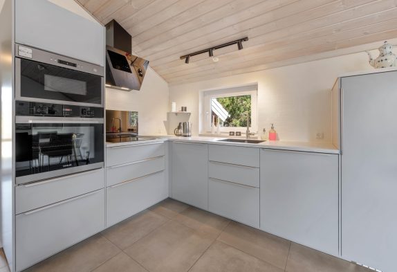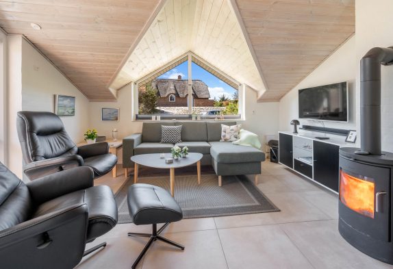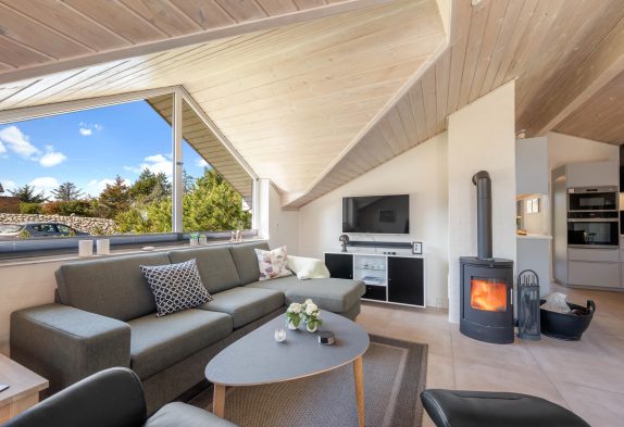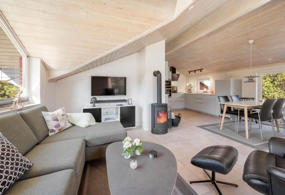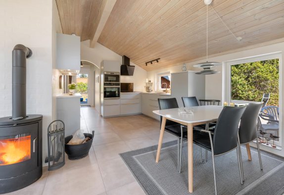 Für gemütliche Urlaubsmomente trefft ihr euch im Wohnbereich, wo Küche, Wohnzimmer und Essbereich offen zueinander angeordnet sind. Der helle Raum mit großen Fenstern lädt zum Kochen, Spielen und Filme schauen ein, während der Holzofen mit seinem knisternden Flammenspiel im Hintergrund die gemütliche Urlaubsatmosphäre vervollständigt.