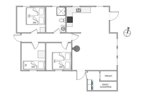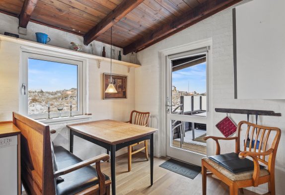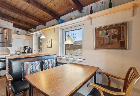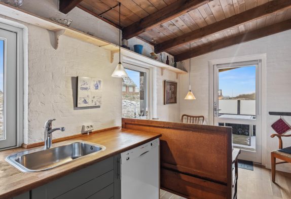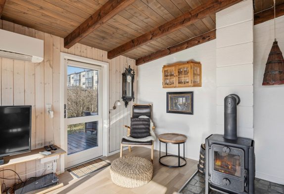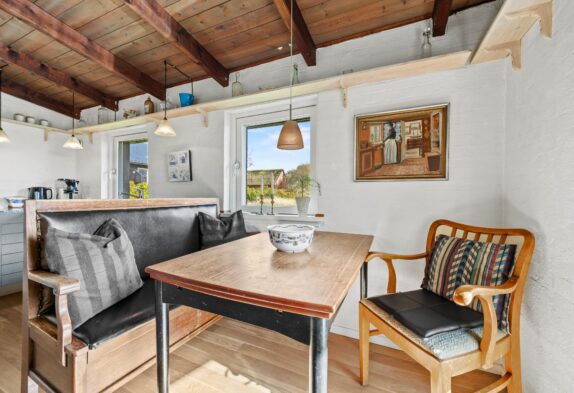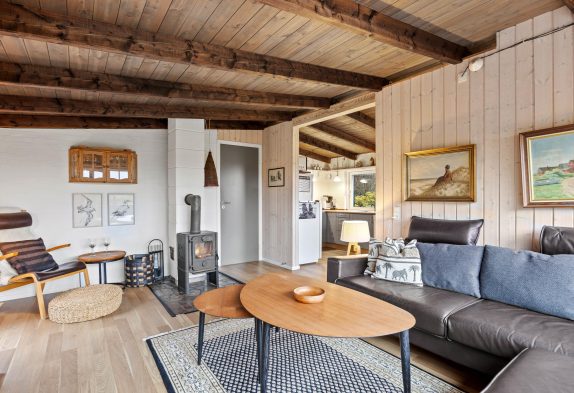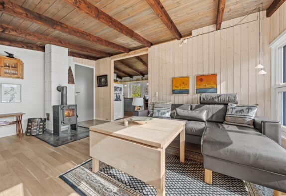 Der Küchenbereich umfasst eine gut ausgestattete Küche mit Essbereich, welche offen mit dem Wohnzimmer verbunden ist. Hier könnt ihr euch entspannt zurücklehnen und die Wärme sowie das leise Knistern des Holzofens im Hintergrund genießen. Das Ferienhaus auf Dalen 2 verfügt zusätzlich zum Kamin auch über eine moderne und energiesparende Wärmepumpe, die für eine schnelle und effiziente Beheizung der Räumlichkeiten sorgt.