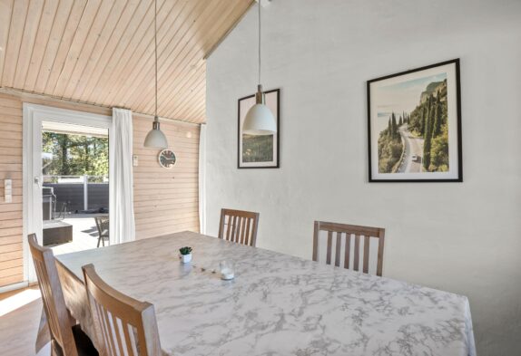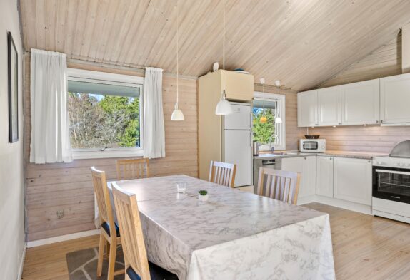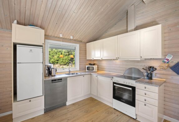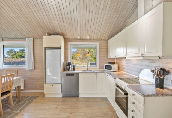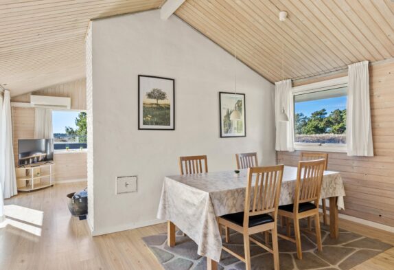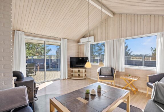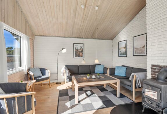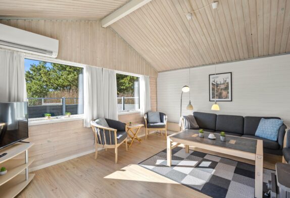 Der großzügige Wohnbereich ist dank der vielen Fenster schön hell. Das verarbeitete helle Holz schafft eine hyggelige Atmosphäre. Hier könnt ihr euch vorm Kamin entspannen und ein gutes Buch lesen oder gemeinsam einen Film schauen. Zusätzlich zum Kamin lässt sich dieses schöne Ferienhaus auch mit der energiesparenden Wärmepumpe heizen.
