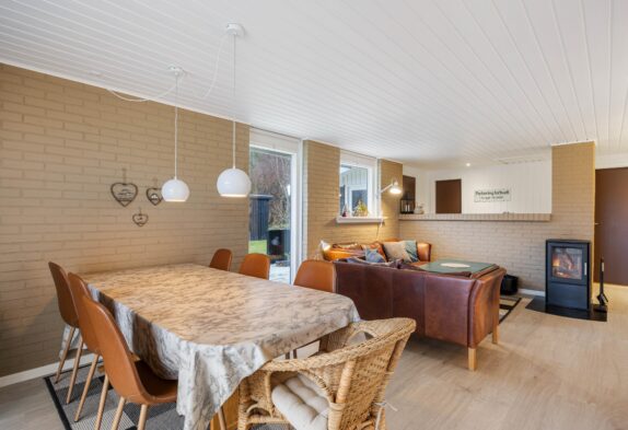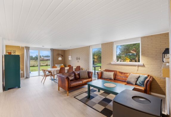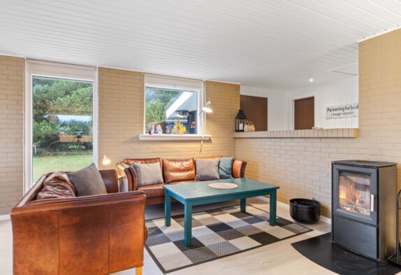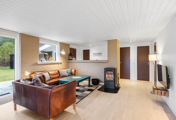 Im Wohnzimmer gibt es auch einen Holzofen, der für die typische Ferienhausatmosphäre sorgt, während er eine angenehme Wärme im Raum verbreitet. Zudem ist das Ferienhaus mit einer Wärmepumpe ausgestattet, die energiefreundlich für ein gutes Raumklima sorgt.