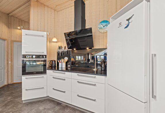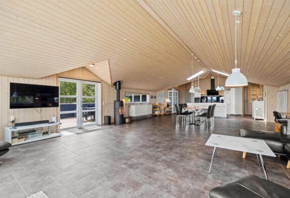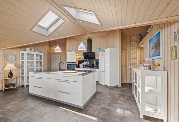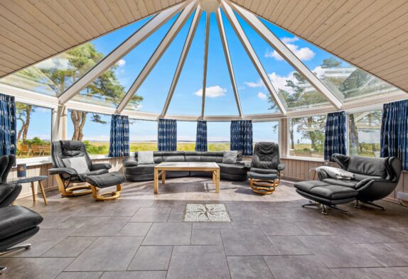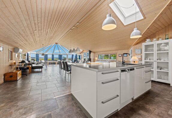 Die besondere Architektur, mit lichtdurchfluteten, hohen Räumen und einer gemütlichen Einrichtung laden zum Wohlfühlen ein. Das Herz des Hauses ist der großzügige Wohn- Essbereich mit offener Küche. Hier ist genügend Platz für gemütliche Stunden vor dem knisternden Kaminfeuer, zum gemeinsamen Kochen oder für einen lustigen Spieleabend. Das Highlight ist das große, runde Panoramafenster mit einem traumhaften Ausblick über die Bucht von Ho, oder in den Sternenhimmel. Der gesamte Wohnbereich hat übrigens eine Fußbodenheizung.