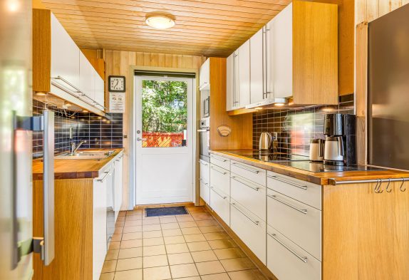 Die offene Küche ist praktisch kombiniert mit dem Essbereich. Eine schöne, funktionale Küche von 2012 mit guter Ablagefläche und Stauplatz, ein selbstabtauender Gefrierschrank (190 Liter) und Kühlschrank, neuwertiger Backofen mit Grill und Pyrolyse Funktion, neuerer Induktions-Herd, 3 Funktionen Mikrowelle und einen Geschirrspüler.