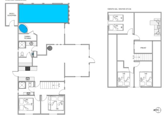 Das Poolhaus auf Gl Skinnevej 10A verfügt über 5 Schlafzimmer die alle mit Doppelbetten aus Boxmatratzen sowie Winterdecken, Sommerdecken, Kissen und Matratzenschonern ausgestattet sind. Das eine Zimmer im Erdgeschoss hat sogar einen 180 cm breites doppelt Hochbett mit 4 Boxmatratzen. In einem der Schlafzimmer in der oberen Etage kann eines der Doppelbetten leicht zu zwei Einzelbetten separiert werden. In jedem Zimmer gibt es einen Full HD LED-TV mit digitalen Kanälen (auch deutsche). In dem einen gibt es sogar einen 40´´ Full HD LED Smart TV mit Chromecast.