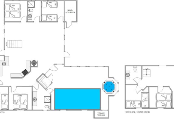 Das große Highlight des Ferienhauses ist der Poolbereich mit Swimmingpool, Whirlpool und Sauna. Wasserratten werden zweifellos viele Stunden mit Spiel und Spaß im Wasser verbringen und diejenigen unter euch, die lieber Entspannung suchen, werden sich in das sprudelnde warme Wasser im Whirlpool setzen oder die angenehme Wärme in der Sauna genießen. Hier könnt ihr wieder Energie tanken.