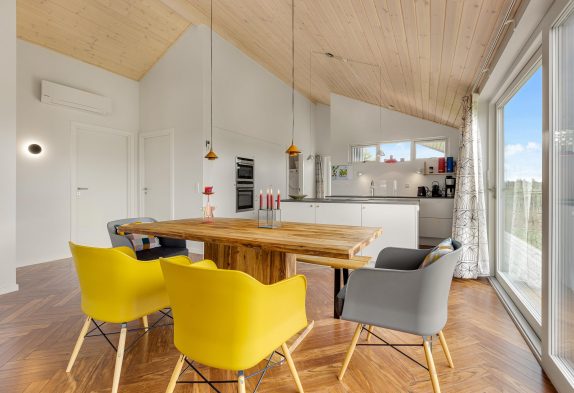 Oder wie wäre es mit einem gemeinsamen Kochabend? In der angrenzenden Küche mit modernen Einbaugeräten bleiben keine Wünsche offen. Hier findet ihr unter anderem eine Spülmaschine, eine Mikrowelle sowie einen Kühlschrank mit Gefrierfach. Der angrenzende Essbereich lässt sich auch für einen Spieleabend gut nutzen. Das Ferienhaus verfügt über eine energiesparende Wärmepumpe, welche ihr zum Heizen nutzen könnt.