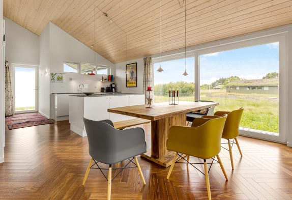 Im großzügigen und offen gestalteten Wohn- und Essbereich, sowie in allen Schlafzimmern, wurde ein hochwertiger Holzfußboden verlegt, der zur Gemütlichkeit im gesamten Ferienhaus beiträgt, hier lassen sich gemütliche Stunden auf dem Sofa genießen.