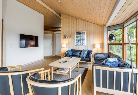 Beim Betreten des Ferienhauses fällt einem direkt das helle Holz der Dachschrägen und die tollen Panoramafenster auf, die sich durch den gesamten Wohnbereich ziehen. Hier kommt viel Licht ins Haus und ihr könnt den einzigartigen Blick ins Grüne genießen. Der Klinkerboden in diesem Bereich verfügt über eine Fußbodenheizung, so dass ihr keine kalten Füße fürchten müsst.