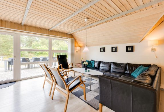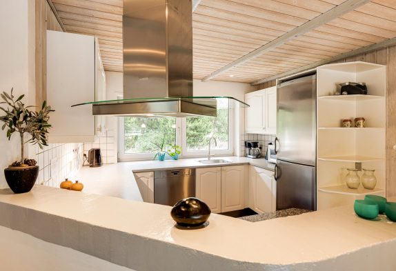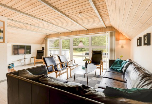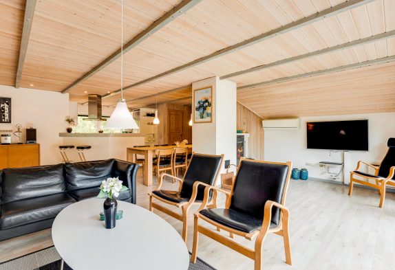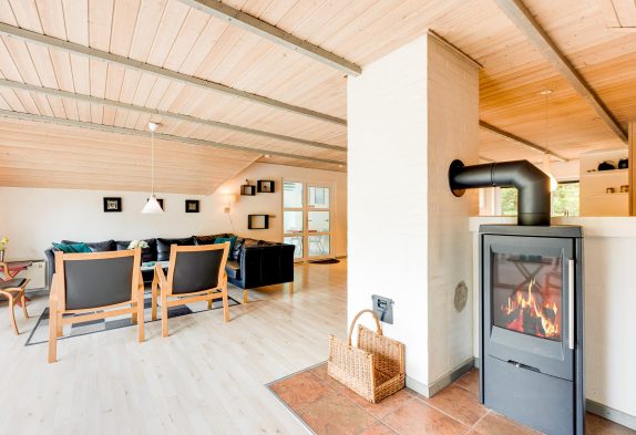 Der schöne Wohnbereich mit Ecksofa und gemütlichen Sesseln lädt zu geselligen Filmabenden bei prasselndem Kaminfeuer ein. Am angrenzenden Essplatz kann nach einem ausgiebigen Frühstück mit der ganzen Familie in den Tag gestartet werden. Die offene Küche bietet sich für gemeinsame Kochabende an. Wie wäre es mit einem skandinavischen Menü?