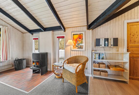 Das Herzstück des Ferienhauses ist das Wohnzimmer mit Kaminofen, der für behagliche Wärme sorgt. Hier könnt ihr nach einem Tag am Strand oder in der Natur entspannen. Die offene Raumgestaltung macht das Ferienhaus perfekt für gemeinsame Zeit – sei es bei einem Filmeabend oder geselligen Spieleabenden.