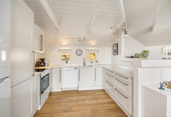 Die angrenzende Küche ist praktisch ausgestattet und bietet mit Geschirrspüler, großem Kühlschrank sowie einem Gefrierfach von 80 Litern alles, was ihr für eure Mahlzeiten benötigt. Auch Angler finden hier ausreichend Platz für ihren Fang. 2 Badezimmer mit Fußbodenheizung erleichtern euch den Alltag, selbst wenn das Ferienhaus voll belegt ist. Waschmaschine und Trockner stehen euch ebenfalls zur Verfügung.