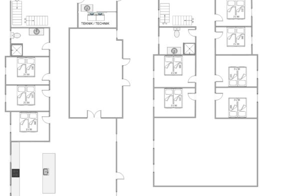 Im Erdgeschoss verfügt das Haus über 3 Doppelschlafzimmer, 1 Badezimmer mit Dusche und 1 Gäste-WC. Im ersten Stock gibt es 6 Doppelzimmer und 1 Badezimmer mit Dusche. Die Bäder sind mit Fußbodenheizung ausgestattet. Im Ferienhaus gibt es eine Waschmaschine und einen Trockner.