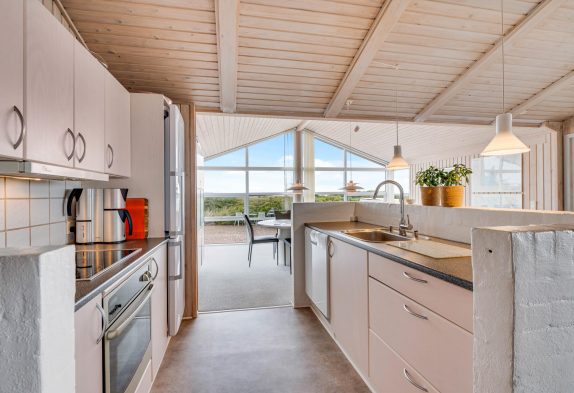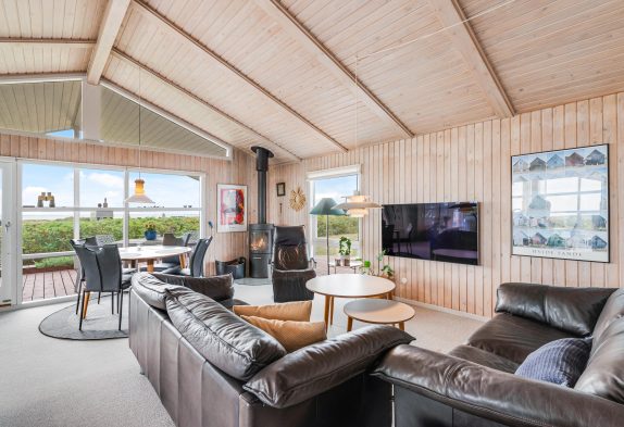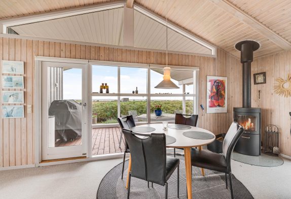 Der großzügige Wohnbereich mit integrierter Küche und sogar 2 Essplätzen wurde mit einem voll verglasten Giebel versehen, welches euch einen fantastischen Panoramablick direkt auf den Ringkøbing Fjord bietet! Hier habt ihr die Möglichkeit, fantastische Sonnenaufgänge zu erleben, welche wirklich spektakulär und in wunderschönen Pastelltönen den Tag begrüßen.