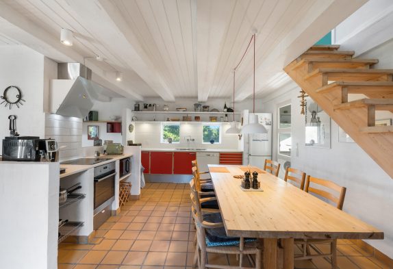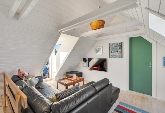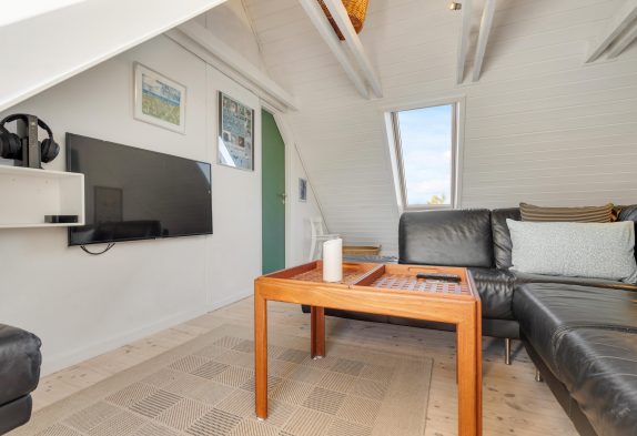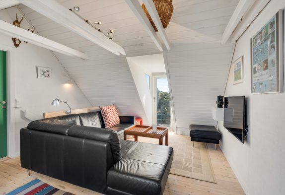 Im Obergeschoss sind die beiden Schlafzimmer. Eines mit einem Doppell- und einem Einzelbett im anderen befinden sich zwei Einzelbetten. Hier ist es durch die Schrägen und die Dachbalken besonders gemütlich. Bestimmt werdet ihr hier gut schlafen, wenn ihr vom Lichtschein des Leuchtturms von Blåvand in den Schlaf begleitet werdet.