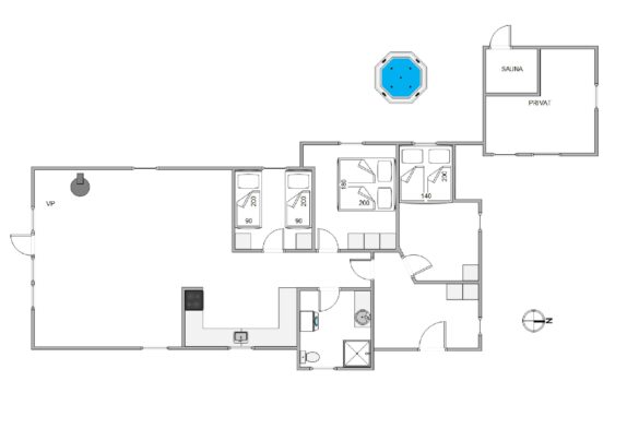 Das Ferienhaus hat drei Schlafzimmer, zwei mit Doppelbetten und eins mit zwei Einzelbetten. Das Badezimmer hat eine wärmende Fußbodenheizung, damit es morgens keine kalten Füße gibt.