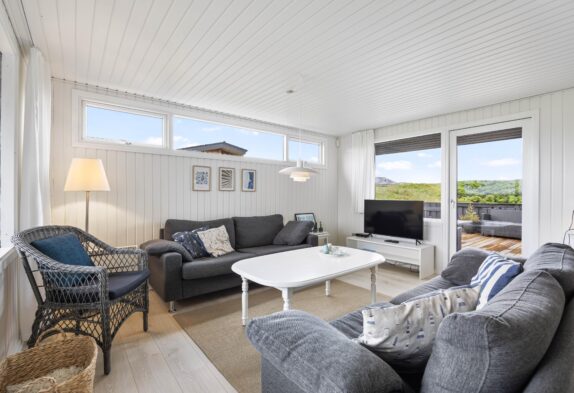 Vom gemütlichen Wohnzimmer aus gelangt ihr auf die großzügige, geschlossene Terrasse. Diese ist besonders für Familien mit kleinen Kindern oder auch Hundebesitzer praktisch. Durch die teilweise Überdachung der Terrasse, findet ihr stets ein geschütztes Plätzchen, an dem ihr in den gemütlichen Gartenmöbeln entspannen könnt. Genießt die herrliche Aussicht auf euer schönes Naturgrundstück und den naheliegenden Fjord bei einem guten Kaffee. Oder wie wäre es mit einem geselligen Grillabend, um den Tag gemeinsam ausklingen zu lassen?