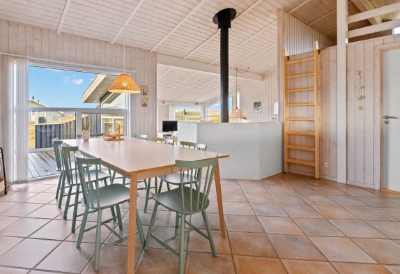 Bereits beim Betreten des Ferienhauses fällt einem das helle Holz auf welches, zusammen mit den vielen Fenstern, zu einer hellen und freundlichen Atmosphäre beiträgt. Vom Wohnbereich aus könnt ihr den Blick durch die große Fensterfront genießen. Bei einem knisternden Kaminfeuer lässt sich gut gemeinsam Fernsehen oder ein Spieleabend veranstalten. Am praktischen Esstisch finden alle gemeinsam Platz. Zusätzlich zum Kamin gibt es im Wohnbereich auch noch eine Fußbodenheizung und auch mit der Wärmepumpe könnt ihr hier energiesparend heizen.