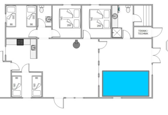 Praktischerweise wurden zwischen dem offenen Wohnbereich und dem Poolbereich Fenster eingebaut, sodass man den Poolbereich immer im Blick hat. Direkt am Poolbereich liegt das große Badezimmer mit Dusche und Sauna. Sinnvollerweise gibt es im Ferienhaus noch eine Gästetoilette. Das Ferienhaus verfügt über 4 Schlafzimmer, 2 Zimmer mit Doppelbetten und 2 Zimmer mit Einzelbetten.