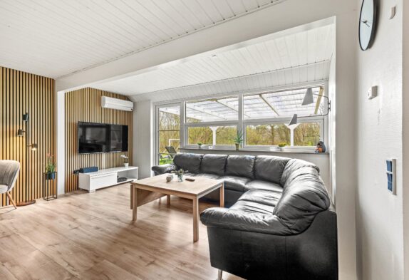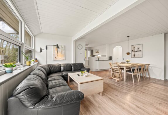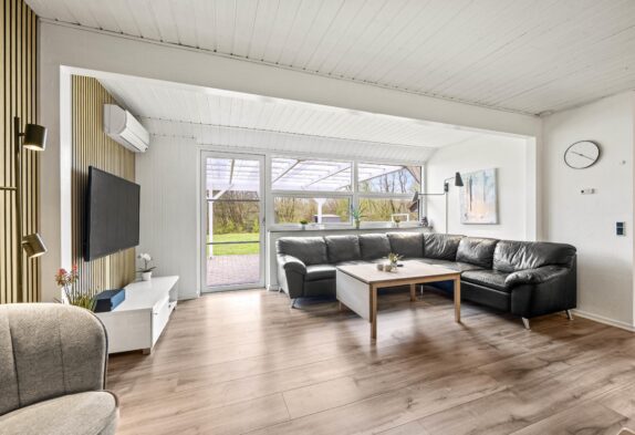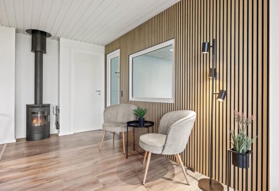 Egal ob es die gut ausgestattete Küche mit Induktionsherd oder Spülmaschine ist oder der offene Wohnbereich mit der großen Fensterfront, von wo aus man einen schönen Blick in den Garten hat. In der Mitte des Wohnzimmers befindet sich der Holzofen, der schnell Wärme ins Ferienhaus bringt und natürlich für „Hygge ”sorgt. Für die kalten Tage steht euch eine energiesparende Wärmepumpe zur Verfügung.