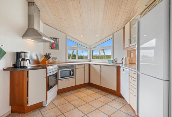 Zusätzlich zum Kamin könnt ihr mit der energiesparenden Wärmepumpe heizen und spart dadurch Energiekosten. Auch eine Fußbodenheizung gibt es im Wohnbereich, sowie in Bad und Gästetoilette. Ihr braucht also keine kalten Füße fürchten. In der praktisch und modern gestalteten Küche, findet ihr natürlich einen Geschirrspüler, eine Kühl-Gefrierkombination und auch eine Mikrowelle. Probiert doch bei einem gemeinsamen Kochabend mal ein skandinavisches Rezept aus.