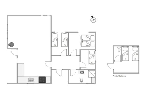 Die 4 Schlafzimmer samt Bad und Gäste WC sind durch eine Tür und einen Flur vom Wohnbereich abgetrennt. So können die Langschläfer in Ruhe ausschlafen, während die Frühaufsteher schon mal den Frühstückstisch decken. Es gibt insgesamt 4 Schlafzimmer, eins mit einem Doppelbett und alle anderen mit Einzelbetten. Es gibt außerdem ein Badezimmer sowie eine weitere Gästetoilette. Morgens muss also keiner Schlange stehen.