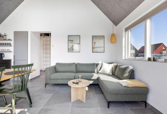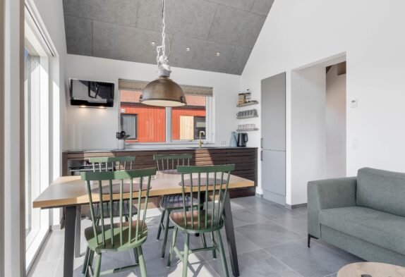 Der helle Wohnraum verfügt, wie alle anderen Räume auch, über eine Fußbodenheizung. Hier müsst ihr also keine kalten Füße fürchten. Am angrenzenden Esstisch könnt ihr gemeinsame Mahlzeiten genießen oder auch den einen oder anderen Spieleabend verbringen. Die offene Küche überzeugt durch ihre moderne und hochwertige Ausstattung. Hier findet ihr z. B. auch eine 80 l Gefriermöglichkeit, welche besonders für die Angler unter euch praktisch ist.