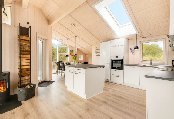 Der moderne Wohnraum mit Panoramafenstern bietet eine fantastische Aussicht in die Heidelandschaft, wo oft Reh, Fuchs und Fasan vorbeikommen. Der offene Giebel bietet ein besonders schönes Wohnambiente, hier kann man dem prasselndem Feuer aus dem Kaminofen lauschen, während man ein gutes Buch liest oder einfach die fantastische Aussicht genießt.