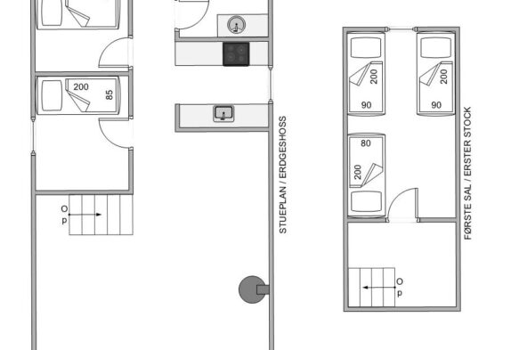 Die Schlafzimmer des Hauses verteilen ich auf beide Stockwerke: im Erdgeschoss gibt es 2 Schlafzimmer, eins mit einem Doppelbett und eins mit einem Einzelbett. Im ersten Stock ist das 3. Schlafzimmer mit 3 Einzelbetten ausgestattet.