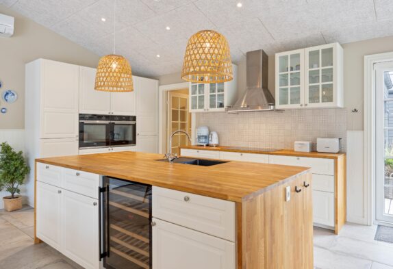 In der angrenzenden, offenen Küche mit großzügigem Essbereich, könnt ihr gemeinsam kochen und neue Rezepte ausprobieren. Hierfür steht euch eine hochwertige Küchenausstattung zur Verfügung. Unter anderen findet ihr hier einen Induktionsherd, eine 75 l große Gefriermöglichkeit und eine Spülmaschine. So müsst ihr euch auch nicht um den Abwasch sorgen, sondern könnt die Urlaubszeit weiter genießen.