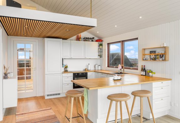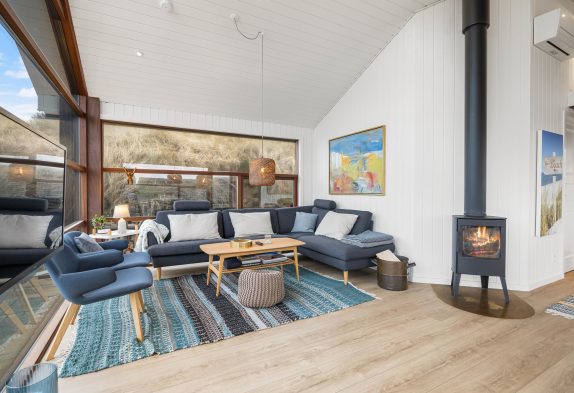 Im hellen Familienzimmer, der die gut ausgestattete Küche und das Wohnzimmer vereint, sorgt der Brennofen mit seinen knisternden Flammen für die Urlaubsstimmung und verbreitet gleichzeitig eine angenehme Wärme im ganzen Raum. Neben dem Brennofen befindet sich im Ferienhaus eine energiesparende Wärmepumpe, die für ein gutes Raumklima sorgt.