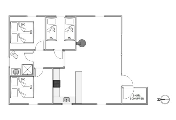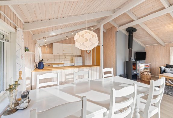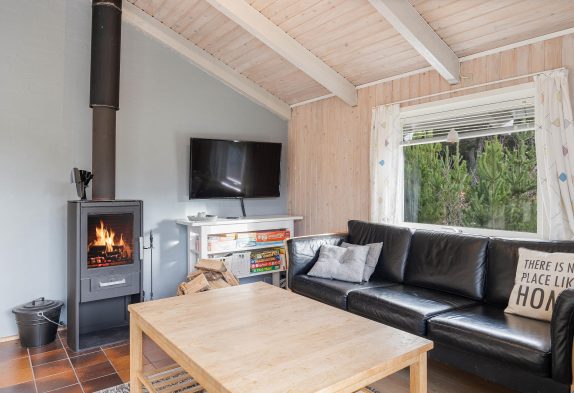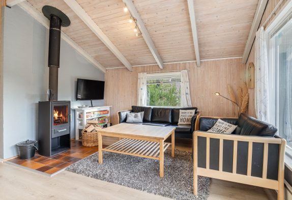 Der zentrale Wohnbereich ist der perfekte Treffpunkt für alle Gäste. Hier könnt ihr euch vor dem Kaminofen entspannen und an kühleren Tagen das knisternde Feuer genießen. Die offene Gestaltung macht es einfach, gemeinsam Zeit zu verbringen, sei es beim Spielen, Lesen oder einfach beim Faulenzen auf der Couch. Und keine Sorge, die moderne Wärmepumpe hält das Ferienhaus immer angenehm temperiert, egal wie das Wetter draußen ist.