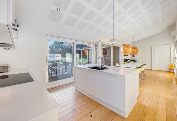 Der helle und moderne Küchen- und Wohnbereich ist das Herz des Ferienhauses und lädt zum gemeinsamen Kochen und beisammen sein ein. Nach dem Essen übernimmt der Geschirrspüler dann den Abwasch, während ihr es euch auf dem Sofa gemütlich macht und mit den Kindern Spiele spielt. Die vielen Fenster lassen viel Licht herein und bieten gleichzeitig einen schönen Blick auf das große Rasengrundstück.