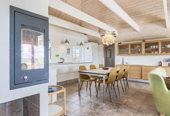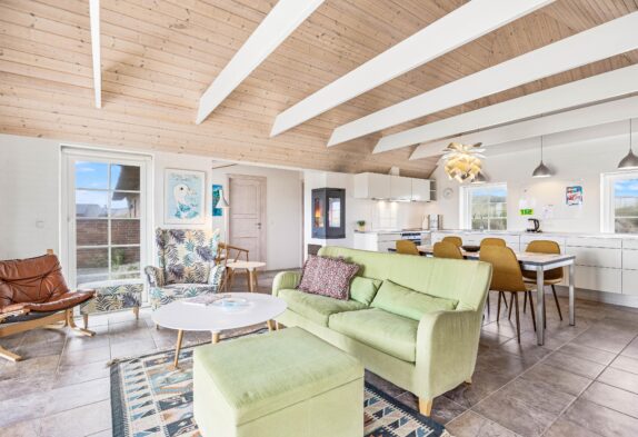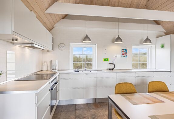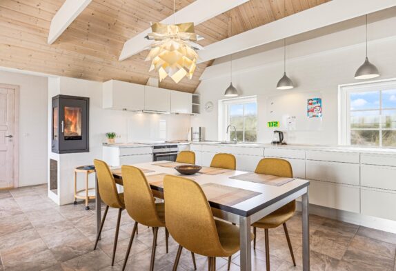Das Herzstück des reetgedeckten Ferienhauses ist der große Wohnbereich, welcher Küche, Wohnzimmer und Essbereich miteinander verbindet. Hier könnt ihr zusammen Zeit verbringen, Spiele spielen, kochen oder die Panoramaaussicht über die umliegende Dünenlandschaft genießen. An kalten Tagen könnt ihr es euch mit einer Tasse Kakao vor dem Holzofen gemütlich machen und dem Knistern des Feuers lauschen. Das Wohnzimmer ist detailverliebt eingerichtet mit großen Fenstern, über die ihr auch Zugang zur Terrasse habt. Die Küche ist groß und mit viel Stauraum ausgestattet. Es gibt außerdem einen Geschirrspüler, der euch den Abwasch erleichtert und einen 200 Liter Gefrierschrank, welcher euch die Planung eurer Einkäufe etwas vereinfacht.