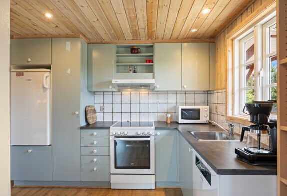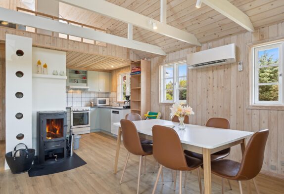 Die Küche des Ferienhauses ist mit Geschirrspüler, Mikrowelle und zusätzlichem 90 l Gefrierschrank gut ausgestattet. Hier findet Ihr alles, um Euch leckere Mahlzeiten zuzubereiten. Das angrenzende Ess- und Wohnzimmer bietet Platz, um gemeinsam zusammenzusitzen, fernsehen zu gucken und bei brennendem Kamin zu entspannen.