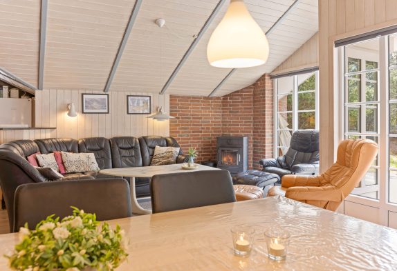 Die gut ausgestattete Küche und der Essbereich des Ferienhauses sind offen mit dem Wohnbereich verbunden, in dem ein gemütlicher Kamin für die richtige Urlaubsatmosphäre sorgt. Zusätzlich könnt ihr natürlich auch mit der energiesparenden Wärmepumpe heizen.