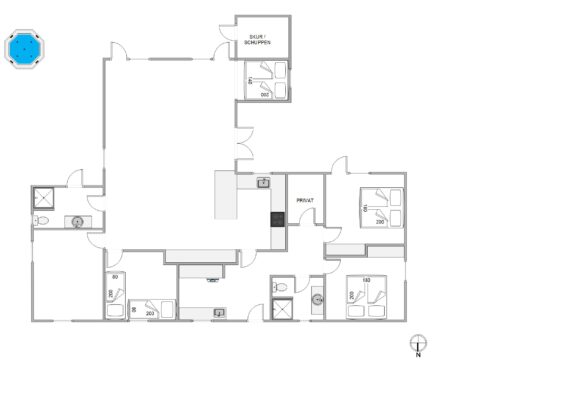 Der Grundriss bietet außerdem 2 moderne Bäder und einen großen Eingangsbereich, in dem auch die Waschmaschine und der Trockner untergebracht wurden. Das ganze Ferienhaus ist mit praktischem Fliesenboden und einer Fußbodenheizung ausgestattet, die mit einer energiesparenden Wärmepumpe betrieben wird.
