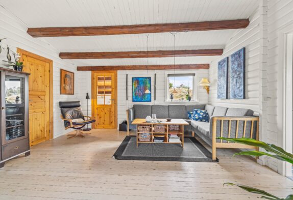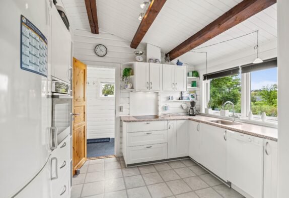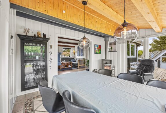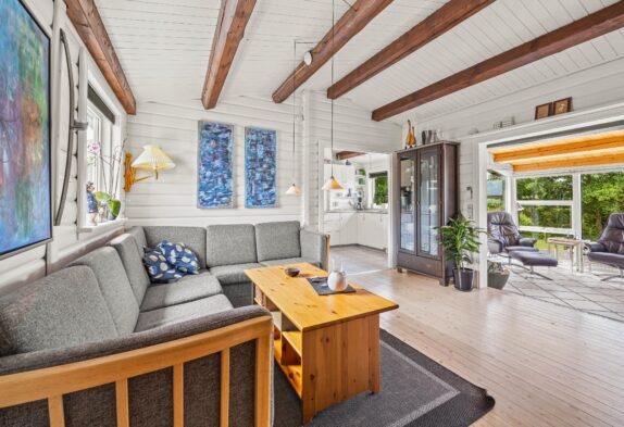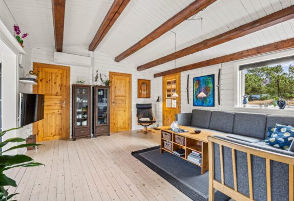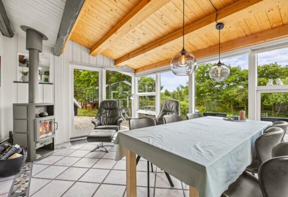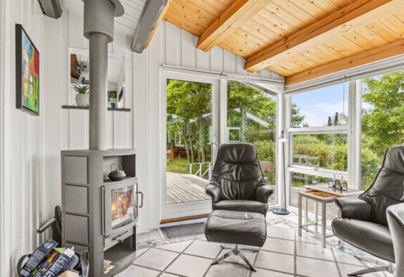 Dieses typisch skandinavische Ferienhaus strahlt Gemütlichkeit und das dänische Lebensgefühl „Hygge“ aus. Hier könnt ihr euch in den bequemen Sitzmöbeln zurücklehnen und gemeinsam eine DVD schauen. Oder ihr zieht euch vor den Kamin zurück und genießt die fantastische Aussicht durch die breite Fensterfront. Diese sorgt für viel natürliches Licht im Ferienhaus. Gemeinsam mit den hellen Möbeln und den sichtbaren Dachbalken, entsteht eine tolle Raumatmosphäre.