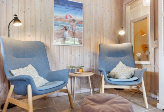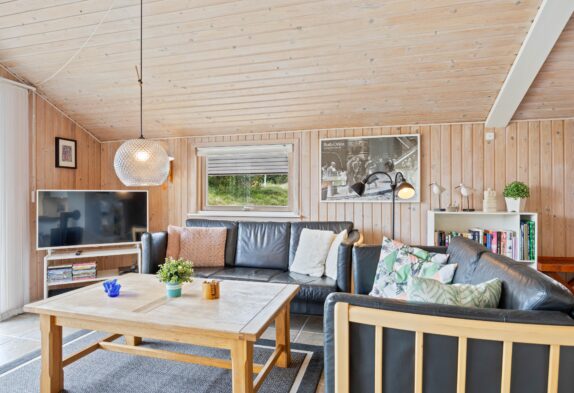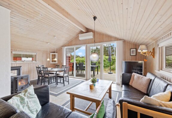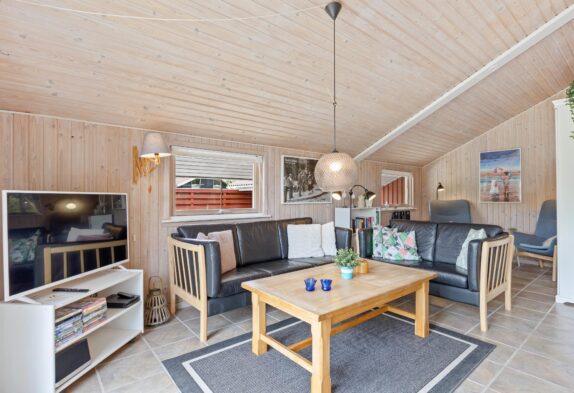 In diesem gemütlichen Ferienhaus werdet ihr euch sofort wie zu Hause fühlen. Die hohen Decken und die helle Holzvertäfelung tragen dazu bei, dass alles hell und freundlich ist. Die großen Fenster sorgen für viel Tageslicht im Wohnzimmer. Von hier aus gibt es auch einen direkten Zugang zur Terrasse. Hier könnt ihr es euch gemeinsam auf dem Sofa gemütlich machen oder in einem der Sessel ein gutes Buch lesen.