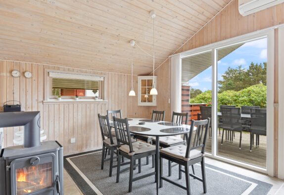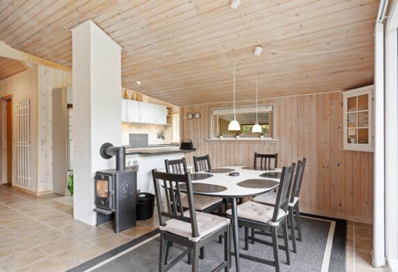 Das knisternde Feuer des Holzofens macht die Urlaubsatmosphäre perfekt. In der offenen Küche, die mit dem Wohnzimmer verbunden ist, findet ihr alles, was ihr braucht, um sich gegenseitig mit leckeren Gerichten zu verwöhnen. Am Esstisch gibt es genügend Platz für Mahlzeiten oder ein gemeinsames Brettspiel.