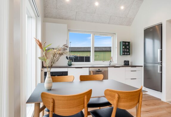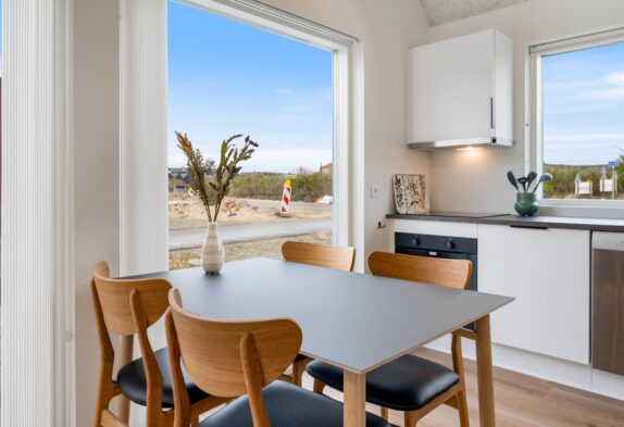 Vom Wohnbereich aus gelangt man auf die offene aber auch teils abgeschirmte Terrasse des Hauses. Hier könnt ihr gemütlich sitzen und einen frisch gebrühten Kaffee mit Blick auf Langsand und Tyskerhavnen genießen. Es ist auch möglich, ein köstliches BBQ auf dem Grill des Hauses zuzubereiten und dieses in den bequemen Terrassenmöbeln zu genießen.
